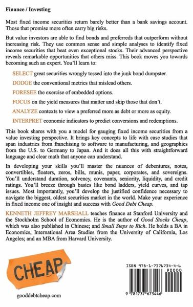 Most fixed income securities return barely better than a bank savings account. Those that promise more often carry big risks. But value investors are able to find bonds and preferreds that outperform without increasing risk. They use common sense and simple analyses to identify fixed income securities that beat even exceptional stocks. Their advanced perspective reveals remarkable opportunities that others miss. This book moves you towards becoming such an expert. You'll learn to: SELECT great securities wrongly tossed into the junk bond dumpster. DODGE the conventional metrics that mislead others. FORESEE the exercise of embedded options. FOCUS on the yield measures that matter and skip those that don't. ANALYZE contexts to view a preferred more as debt or more as equity. INTERPRET economic indicators to predict conversions and redemptions. This book shares with you a model for gauging fixed income securities from a value investing perspective. It brings key concepts to life with case studies that span industries from franchising to software to manufacturing, and geographies from the U.S. to Germany to Japan. And it does all this with straightforward language and clear math that anyone can understand. In developing your skills you'll master the nuances of debentures, notes, convertibles, floaters, zeros, bills, munis, paper, corporates, and sovereigns. You'll understand duration, solvency, covenants, seniority, liquidity, and credit ratings. You'll breeze through basics like bond ladders, yield curves, and tap issues. Most importantly, you'll develop the justified confidence necessary to navigate the biggest, oldest securities market in the world. Make your experience in fixed income one of insight and success with Good Debt Cheap.