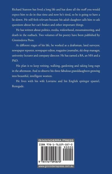 Richard Stanton has lived a long life and has done all the stuff you would expect him to do in that time and now he's tired so he is going to have a lie down. He still feels relevant because his adult daughter calls him to ask questions about her car's brakes and other important things. He has written about politics, media, widowhood, mountaineering, and death in the outback. Two volumes of his poetry have been published by Ginninderra Press. At different stages of his life he worked as a draftsman, land surveyor, newspaper reporter, newspaper editor, magazine journalist, ski shop manager, university lecturer, and company director. He has earned a BA, an MA and a PhD. His plan is to keep writing, walking, gardening, and taking long naps in the afternoon. And to observe his three fabulous grand-daughters growing into beautiful, intelligent women. He lives with his wife Lorraine and his English springer spaniel, Renegade.