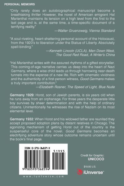 'Only rarely does an autobiographical manuscript become a breathtaking thriller However, the novel of American emigrant Hal Marienthal maintains its tension on a high level from the first to the last page and is, at the same time, a time-specific document of a terrifying reality." -Walter Gruenzweig, Vienna Standard 'A soul-riveting, heart-shattering personal account of the Holocaust, from the 1920's to liberation under the Statue of Liberty. Absolutely spell-binding." -Kenneth Lincoln (UCLA), Men Down West, The Good Red Road, A Writer's China 'Hal Marienthal writes with the assured rhythms of a gifted storyteller. This coming-of-age narrative carries us deep into the heart of Nazi Germany, where a wise child leads us through harrowing near-death tunnels into the expanse of a new life. Rich with cinematic vividness and the authenticity of a first-person witness, Good Germans makes a truly important contribution." -Elizabeth Rosner, The Speed of Light, Blue Nude Germany 1929: Horst, son of Jewish parents, is six years old when he runs away from an orphanage. For three years the desperate little boy survives by sheer determination and with the help of ordinary citizens. Unintentionally he witnesses the rise of Nazism on its most elemental level. Germany 1932: When Horst and his widowed father are reunited they accept proposed adoption plans by distant relatives in Chicago. The agonizing mechanism of getting Horst out of the country is the suspenseful core of the novel. Good Germans becomes an electrifying adventure story whose outcome remains uncertain until the book's final page.