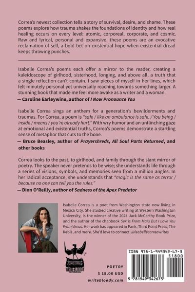Good Girl and Other Yearnings is epic in its scope-from "Quantum Mechanics And You" to "Little Red Riding Hood Buys A 6-Pack After EMDR," these poems turn the confessional genre on its head. Correa's debut full-length collection explores how trauma shakes the foundations of identity, and how healing happens on every level: atomic, corporeal, corporate, and cosmic. This poetry collection tells the story of survival, desire, and shame. Correa covers a vast landscape of experience-childhood, fertility, loss, abuse, drugs, astrology, the 9-5-in a singular voice that makes you feel grounded and untethered all at once. Raw and lyrical, personal and expansive, achingly honest and linguistically delightful, these poems are an evocative reclamation of self, a bold bet on existential hope when existential dread is throwing punches.