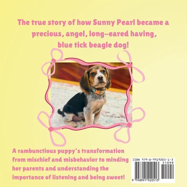 "Good Girl, Sunny Pearl!" follows a rambunctious beagle puppy who is full of mischief and never listens to her parents. Her antics drive them crazy until one day she decides to turn things around and become the beloved beagle they always knew she could be! This story captures her journey of transformation and the challenges she faces along the way, ultimately showing the importance of listening and making positive choices. This children's book is filled with fun, colorful images, and features a fun rhyming read! It is perfect for any dog lover of any age who has survived the infamous puppy training stage! Come follow Sunny Pearl's journey as she grows from a rambunctious beagle puppy to the most perfect beagle dog!