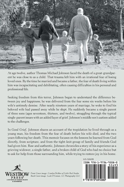 At age twelve, author Thomas Michael Johnson faced the death of a great-grandparent he was close to as a child. That trauma left him with an irrational fear of losing loved ones. By the time he married and became a father, the fear of death living within him was incapacitating and debilitating, often causing difficulties in his personal and professional life. Seeking freedom from this terror, Johnson began to understand the difference between joy and happiness; he was delivered from the fear some six weeks before his wife's untimely demise. After nearly nineteen years of marriage, he woke to find his beloved wife had passed away while he slept. He suddenly became a single parent of three sons (ages seventeen, thirteen, and twelve), struggling through the typical single-parent issues with an added layer of grief. Johnson's middle son's autism added to the challenges. In Good Grief, Johnson shares an account of the trepidation he lived through as a young man, his freedom from the fear of death before his wife died, and the two years following her death. This memoir focuses on the lessons he learned from God directly, from scripture, and from the tight-knit group of family and friends God had given him. Raw and authentic, Johnson chronicles a story of his experience as a grieving widower, a single father, and a broken child of God who had no choice but to ask for help from those surrounding him, while trying to restore joy in his home.