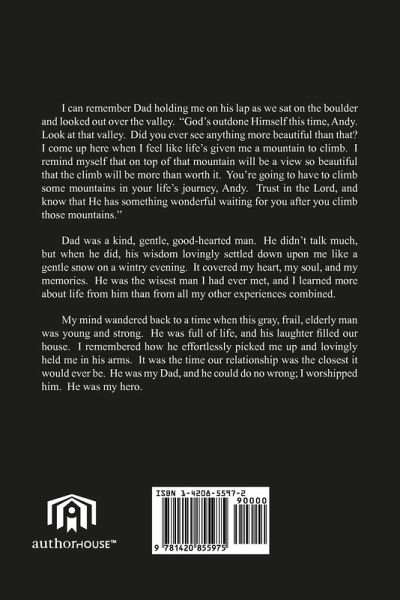 I can remember Dad holding me on his lap as we sat on the boulder and looked out over the valley. "God's outdone Himself this time, Andy. Look at that valley. Did you ever see anything more beautiful than that? I come up here when I feel like life's given me a mountain to climb. I remind myself that on top of that mountain will be a view so beautiful that the climb will be more than worth it. You're going to have to climb some mountains in your life's journey, Andy. Trust in the Lord, and know that He has something wonderful waiting for you after you climb those mountains." Dad was a kind, gentle, good-hearted man. He didn't talk much, but when he did, his wisdom lovingly settled down upon me like a gentle snow on a wintry evening. It covered my heart, my soul, and my memories. He was the wisest man I had ever met, and I learned more about life from him than from all my other experiences combined. My mind wandered back to a time when this gray, frail, elderly man was young and strong. He was full of life, and his laughter filled our house. I remembered how he effortlessly picked me up and lovingly held me in his arms. It was the time our relationship was the closest it would ever be. He was my Dad, and he could do no wrong; I worshipped him. He was my hero.