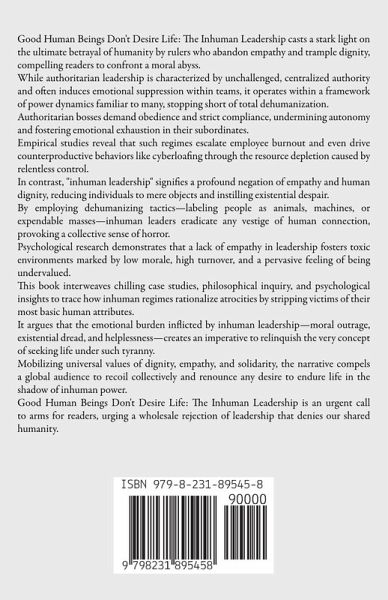 Good Human Beings Don't Desire Life: The Inhuman Leadership casts a stark light on the ultimate betrayal of humanity by rulers who abandon empathy and trample dignity, compelling readers to confront a moral abyss. While authoritarian leadership is characterized by unchallenged, centralized authority and often induces emotional suppression within teams, it operates within a framework of power dynamics familiar to many, stopping short of total dehumanization. Authoritarian bosses demand obedience and strict compliance, undermining autonomy and fostering emotional exhaustion in their subordinates. Empirical studies reveal that such regimes escalate employee burnout and even drive counterproductive behaviors like cyberloafing through the resource depletion caused by relentless control. In contrast, "inhuman leadership" signifies a profound negation of empathy and human dignity, reducing individuals to mere objects and instilling existential despair. By employing dehumanizing tactics-labeling people as animals, machines, or expendable masses-inhuman leaders eradicate any vestige of human connection, provoking a collective sense of horror. Psychological research demonstrates that a lack of empathy in leadership fosters toxic environments marked by low morale, high turnover, and a pervasive feeling of being undervalued. This book interweaves chilling case studies, philosophical inquiry, and psychological insights to trace how inhuman regimes rationalize atrocities by stripping victims of their most basic human attributes. It argues that the emotional burden inflicted by inhuman leadership-moral outrage, existential dread, and helplessness-creates an imperative to relinquish the very concept of seeking life under such tyranny. Mobilizing universal values of dignity, empathy, and solidarity, the narrative compels a global audience to recoil collectively and renounce any desire to endure life in the shadow of inhuman power. Good Human Beings Don't Desire Life: The Inhuman Leadership is an urgent call to arms for readers, urging a wholesale rejection of leadership that denies our shared humanity.