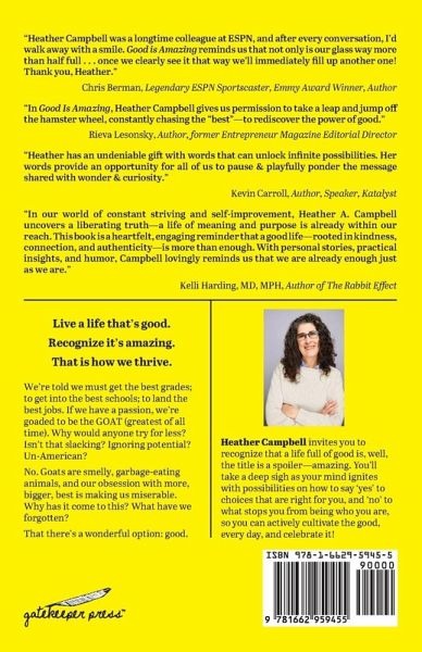 Good Is Amazing: Letting Go of Our Over Striving and Celebrating the Good! is an invitation to recognize that a life full of good is, well, the title is a spoiler—amazing. This simple idea is deceptively difficult to believe, but Good is Amazing empowers people to admit there is a problem with our constant striving and lean into going for good instead. We’re told to get the best grades, get into the best schools, and land the best job. But that job’s just a stepping stone to the next one. More is always needed. If we have a passion in our life, we’re goaded to try to be the G.O.A.T. (Greatest of All Time). If we want to start a company, the goal is to aim for a Unicorn (a billion-dollar valuation before going public). Why would anyone ever actively try for less? Isn’t that slacking? Ignoring your potential? Un-American? No. Goats are smelly, garbage-eating animals and unicorns aren’t real. Not only is our obsession with more, bigger, and better making people miserable every day, it’s also linked to worse physical health, lower life satisfaction, and more frequent suicidal thoughts. It creates depression, costing society millions in lost productivity and health costs. Why has it come to this? What have we forgotten? That there’s a wonderful option: good. Good is Amazing empowers readers to sit down and take a breath. To recognize that a life that is good—solidly good—is a life that is full. Satisfying. Amazing. Studies have shown that financially we need to meet our foundational needs and a little bit more, but holding onto this concept is nearly impossible in today’s world. Good is Amazing makes it easier. Through relatable stories, readers feel validated to choose to embrace the immense power and incredible beauty of achieving a life full of good results. The stories in Good is Amazing offer examples on how to say ‘yes’ to unconventional choices and ‘no’ to what stops you from being who you want to be. Each chapter ends with simple action steps that help the reader take micro and macro actions to achieve good in their own lives. Readers will take a deep sigh as their minds ignite with possibility from the offerings on ways to actively cultivate good every day. Live a life that’s good. Recognize it’s amazing. That is how we thrive.