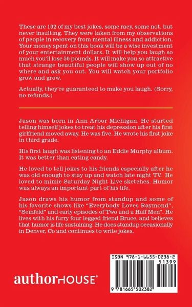 These are 102 of my best jokes, some racy, some not, but never insulting. They were taken from my observations of people in recovery from mental illness and addiction. Your money spent on this book will be a wise investment of your entertainment dollars. It will help you laugh so much you'll lose 50 pounds. It will make you so attractive that strange beautiful people will show up out of no where and ask you out. You will watch your portfolio grow and grow. Actually, they're guaranteed to make you laugh. (Sorry, no refunds.)