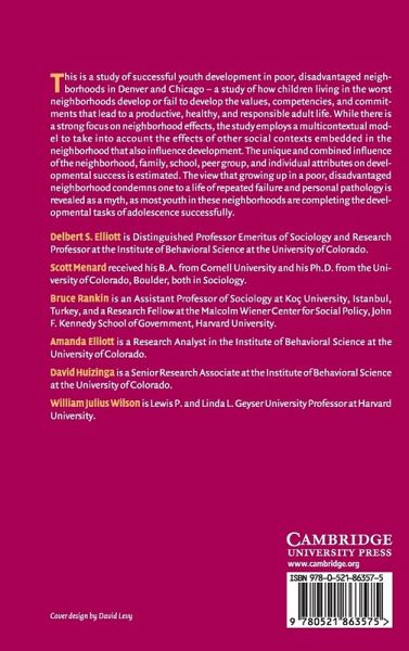 This is a study of successful youth development in poor, disadvantaged neighborhoods in Denver and Chicago - a study of how children living in the worst neighborhoods develop or fail to develop the values, competencies and commitments that lead to a productive, healthy responsible adult life. While there is a strong focus on neighborhood effects, the study employs a multicontextual model examining both the direct effects of the neighborhood ecology, social organization and contexts embedded in the neighborhood. The unique and combined influence of the neighborhood, family, school, peer group and individual attributes on developmental success is estimated. The view that growing up in a poor, disadvantaged neighborhood condemns one to a life of repeated failure and personal pathology is revealed as a myth, as most youth in these neighborhoods are completing the developmental tasks of adolescence successfully.
