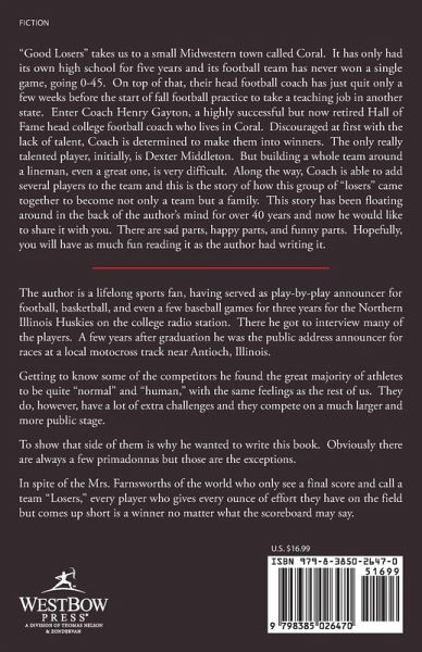"Good Losers" takes us to a small Midwestern town called Coral. It has only had its own high school for five years and its football team has never won a single game, going 0-45. On top of that, their head football coach has just quit only a few weeks before the start of fall football practice to take a teaching job in another state. Enter Coach Henry Gayton, a highly successful but now retired Hall of Fame head college football coach who lives in Coral. Discouraged at first with the lack of talent, Coach is determined to make them into winners. The only really talented player, initially, is Dexter Middleton. But building a whole team around a lineman, even a great one, is very difficult. Along the way, Coach is able to add several players to the team and this is the story of how this group of "losers" came together to become not only a team but a family. This story has been floating around in the back of the author's mind for over 40 years and now he would like to share it with you. There are sad parts, happy parts, and funny parts. Hopefully, you will have as much fun reading it as the author had writing it.