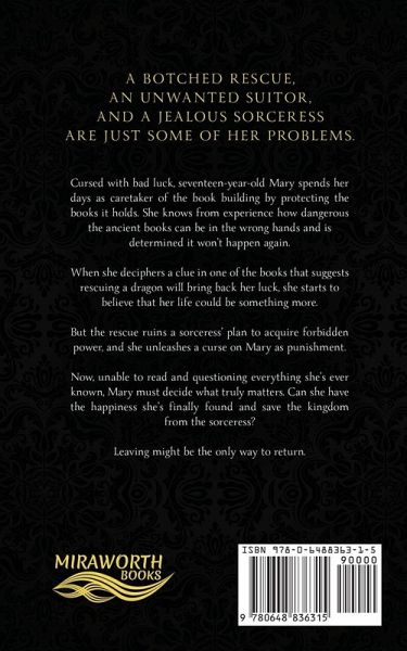 A botched rescue, an unwanted suitor, and a jealous sorceress are just some of her problems. Cursed with bad luck, seventeen-year-old Mary spends her days as caretaker of the book building by protecting the books it holds. She knows from experience how dangerous the ancient books can be in the wrong hands and is determined it won't happen again. When she deciphers a clue in one of the books that suggests rescuing a dragon will bring back her luck, she starts to believe that her life could be something more. But the rescue ruins a sorceress' plan to acquire forbidden power, and she unleashes a curse on Mary as punishment. Now, unable to read and questioning everything she's ever known, Mary must decide what truly matters. Can she have the happiness she's finally found and save the kingdom from the sorceress? Leaving might be the only way to return.