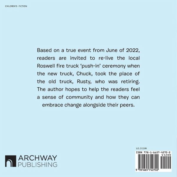 Based on a true event from June of 2022, readers are invited to re-live the local Roswell fire truck 'push-in' ceremony when the new truck, Chuck, took the place of the old truck, Rusty, who was retiring. The author hopes to help the readers feel a sense of community and how they can embrace change alongside their peers.