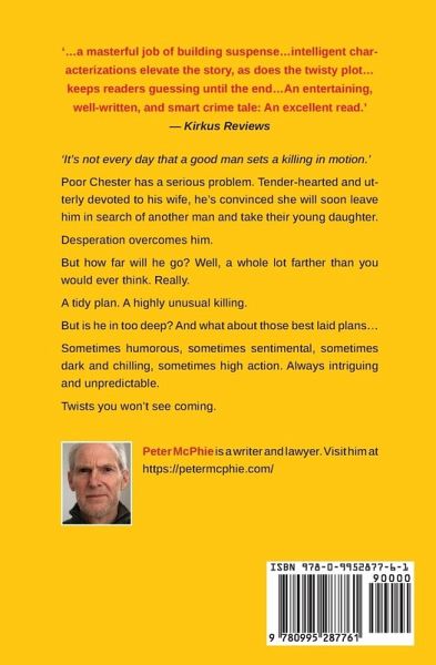 'It's not every day that a good man sets a killing in motion. But sometimes in a life there are desperate times and those times can be answered only with desperate measures.' Chester has a serious problem. Tender-hearted and utterly devoted to his wife, he's convinced she will soon leave him in search of another and take their young daughter. Desperation overcomes him. But how far will he go? A whole lot farther than you would ever think. Really. A tidy plan. A highly unusual killing. A quirky romantic suspense thriller that's both light and dark. A tale of love dangerously on the brink. Sometimes humorous, sometimes sentimental, sometimes chilling, sometimes high action, but always intriguing. Unpredictable twists you just won't see coming. Kirkus Reviews says, 'An entertaining, well-written, and smart crime tale: An excellent read.' Reviews by readers say: 'You think you know what's happening, but you don't!' 'A smart, suspenseful crime drama involving a hit man, a dastardly plot, a serial killer, crime-solving, marital mistrust, as well as emotionally textured characters.' 'Not your typical suspense story.' 'Never read anything quite like this before'. The book says 'never underestimate the obvious' and I did just that because it's not what you think.' 'Wow! What a fun read! Surprises galore...kept me guessing, and guessing wrong...a very clever book'. 'This book was full of surprises. As someone who reads a lot of thrillers, I did not guess the twists until they were right in front of me'. 'It's very clever. Things aren't what they seem. When you think you know what's coming, you'll be shocked!' 'I loved this book! I read a lot of thrillers and did not see the twists coming.' 'You're kept on the edge of your seat wondering how Chester will get out of the mess he finds himself in. And a great twist at the end.' 'An unexpected mystery with surprising twists and developed characters.' 'Get ready for a thrilling ride, an intriguing mystery. You won't see it coming.' 'Twists and turns that lead to a totally unexpected ending.' 'The suspense builds as the story unfolds.' 'Blew me away at the end.'