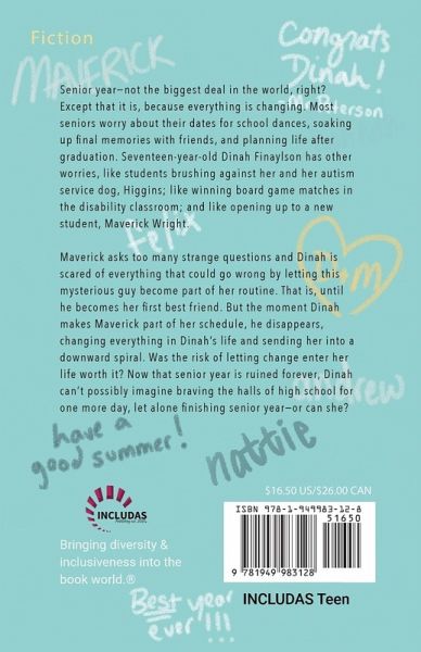 He's all about change. She's not. Senior year-not the biggest deal in the world, right? Except that it is, because everything is changing. Most seniors worry about their dates for school dances, soaking up final memories with friends, and planning life after graduation. Seventeen-year-old Dinah Finaylson has other worries, like students brushing against her and her autism service dog, Higgins; like winning board game matches in the disability classroom; and like opening up to a new student, Maverick Wright. Maverick asks too many strange questions and Dinah is scared of everything that could go wrong by letting this mysterious guy become part of her routine. That is, until he becomes her first best friend. But the moment Dinah makes Maverick part of her schedule, he disappears, changing everything in Dinah's life and sending her into a downward spiral. Was the risk of letting change enter her life worth it? Now that senior year is ruined forever, Dinah can't possibly imagine braving the halls of high school for one more day, let alone finishing senior year-or can she?