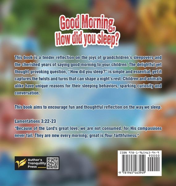 This book is a tender reflection on the joys of grandchildren's sleepovers and the cherished years of saying good morning to your children. The delightful yet thought-provoking question, "How did you sleep?" is simple and essential, yet it captures the twists and turns that can shape a night's rest. Children and animals alike have unique reasons for their sleeping behaviors, sparking curiosity and conversation. This book aims to encourage fun and thoughtful reflection on the way we sleep. Lamentations 3:22-23 "Because of the Lord's great love, we are not consumed, for His compassions never fail. They are new every morning; great is Your faithfulness."