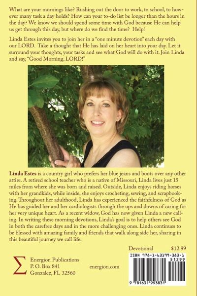 What are your mornings like? Rushing out the door to work, to school, to however many task a day holds? How can your to-do list be longer than the hours in the day? We know we should spend some time with God because He can help us get through this day, but where do we find the time? Help! Linda Estes invites you to join her in a "one minute devotion" each day with our LORD. Take a thought that He has laid on her heart into your day. Let it surround your thoughts, your tasks and see what God will do with it. Join Linda and say, "Good Morning, LORD!"