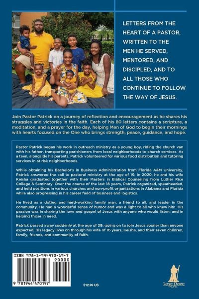 Letters from the heart of pastor, written to the men he served, mentored, and discipled, and to all those who continue to follow the way of Jesus. Join Pastor Patrick on a journey of reflection and encouragement as he shares his struggles and victories in the faith. Each of his 80 letters contains a scripture, a meditation, and a prayer for the day, helping Men of God to begin their mornings with hearts focused on the One who brings strength, peace, guidance, and hope.