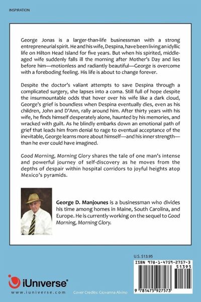 George Jonas is a larger-than-life businessman with a strong entrepreneurial spirit. He and his wife, Despina, have been living an idyllic life on Hilton Head Island for five years. But when his spirited, middle-aged wife suddenly falls ill the morning after Mother's Day and lies before him-motionless and radiantly beautiful-George is overcome with a foreboding feeling. His life is about to change forever. Despite the doctor's valiant attempts to save Despina through a complicated surgery, she lapses into a coma. Still full of hope despite the insurmountable odds that hover over his wife like a dark cloud, George's grief is boundless when Despina eventually dies, even as his children, John and D'Ann, rally around him. After thirty years with his wife, he finds himself desperately alone, haunted by his memories, and wracked with guilt. As he blindly embarks down an emotional path of grief that leads him from denial to rage to eventual acceptance of the inevitable, George learns more about himself-and his inner strength-than he ever could have imagined. Good Morning, Morning Glory shares the tale of one man's intense and powerful journey of self-discovery as he moves from the depths of despair within hospital corridors to joyful heights atop Mexico's pyramids.