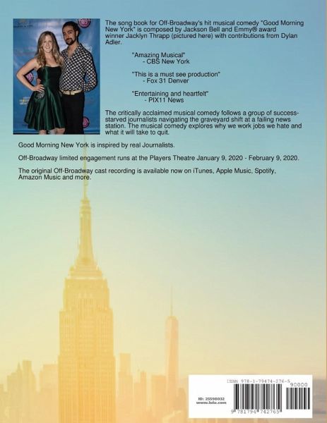 The song book for Off-Broadway's hit musical comedy "Good Morning New York" is composed by Jackson Bell, Emmy® award winnerJacklyn Thrapp and Dylan Adler. "Amazing Musical" - CBS New York "This is a must see production" - Fox 31 Denver "Entertaining and heartfelt" - PIX11 News The critically acclaimed musical comedy follows a group of success-starved journalists navigating the graveyard shift at a failing news station. The musical comedy explores why we work jobs we hate and what it will take to quit. Good Morning New York is inspired by real Journalists. Off-Broadway limited engagement runs at the Players Theatre January 9, 2020 - February 9, 2020. The original Off-Broadway cast recording is available now on iTunes, Apple Music, Spotify, Amazon Music and more.