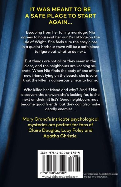 'I thoroughly enjoyed this intriguing mystery set in a beautiful location with deliciously menacing undercurrents.' Frances Evesham It was meant to be a safe place to start again... In need of an escape from her failing marriage, Nia agrees to house-sit her aunt's cottage on the Isle of Wight. She feels sure the cosy close in a quaint harbour town will be a safe place to hide and figure out what to do next.But things are not all as they seem in the close, and the neighbours who welcome her with open arms, are keeping secrets. When Nia finds the body of one of her new friends lying on the beach, she feels sickeningly sure that the killer is dangerously near to home. Who killed her friend and why did she have to die? And if Nia discovers the answers she's looking for, is she next on their hit list? Good neighbours may become good friends, but they can also make deadly enemies... Mary Grand's intricate psychological mysteries are perfect for fans of Claire Douglas, Lucy Foley and Agatha Christie. What readers are saying about Mary Grand: 'Truly a great puzzler with a superb ending! I HIGHLY Recommend!!!' 'Wow I'm so so impressed it had me gripped start to finish and I couldn't put it down. I completed within 1 night and such a page turner' 'So many twists and turns to keep the reader guessing to the very end. An excellent read.' 'Brilliant if you love psychological thrillers like me.' 'A sinister "whodunit" that is not your typical police procedural.'