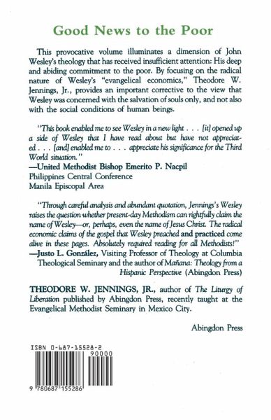 This provocative volume illuminates a dimension of John Wesley's theology that has received insufficient attention: his deep and abiding commitment to the poor. By focusing on the radical nature of Wesley's "evangelical economics," Theodore W. Jennings, Jr., provides an important corrective to the view that Wesley was concerned with the salvation of souls only, and not also with the social conditions of human beings.