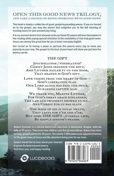 Open this Good News Trilogy, and take a chance on being overcome with good news. This book is simply a collection of good, gospel-expounding poems. If you are turned on to the gospel, you may like poems that enlighten you to the full meaning of trusting Jesus for your present-day living. It is my earnest desire that whoever picks up these 93 poems will lose themselves in the reading while paying special attention to the availability of this truly good news. Jesus can convey His great love for you in basic everyday English. Get turned on to having a poem or perhaps five poems every day to move you joyously on your way. The gospel to the beat of your heart will show you just how fun poetry can be.