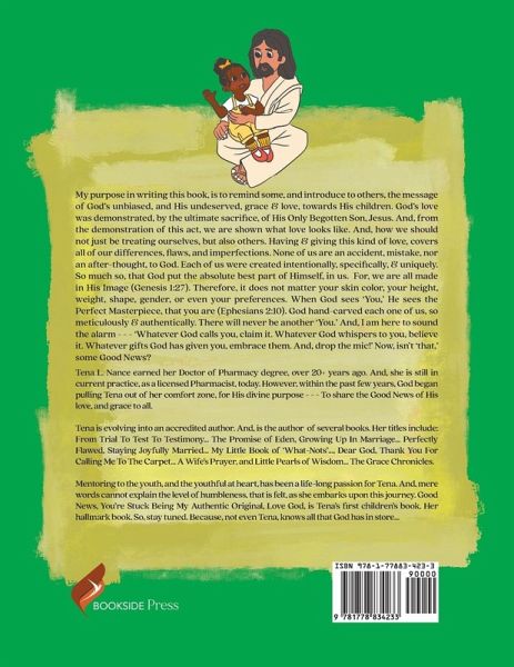 My purpose in writing this book, is to remind some, and introduce to others, the message of God's unbiased, and His undeserved, grace & love, towards His children. God's love was demonstrated, by the ultimate sacrifice, of His Only Begotten Son, Jesus. And, from the demonstration of this act, we are shown what love looks like. And, how we should not just be treating ourselves, but also others. Having & giving this kind of love, covers all of our differences, flaws, and imperfections. None of us are an accident, mistake, nor an after-thought, to God. Each of us were created intentionally, specifically, & uniquely. So much so, that God put the absolute best part of Himself, in us. For, we are all made in His Image (Genesis 1:27). Therefore, it does not matter your skin color, your height, weight, shape, gender, or even your preferences. When God sees 'You, ' He sees the Perfect Masterpiece, that you are (Ephesians 2:10). God hand-carved each one of us, so meticulously & authentically. There will never be another 'You.' And, I am here to sound the alarm - - - 'Whatever God calls you, claim it. Whatever God whispers to you, believe it. Whatever gifts God has given you, embrace them. And, drop the mic!' Now, isn't 'that, ' some Good News?