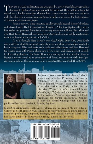 The year is 1920, and Bostonians from all walks of life- rich and poor, young and old, blue collar and white collar- are being enticed to invest their life savings with a friendly, charismatic Italian-American by the name of Charles Ponzi. Some are well meaning, while others are simply greedy. Little do they know that he is neither a financial wizard nor a boldly innovative thinker, but a grandiose fraudster and clever con artist who has kept under wraps a Canadian prison record for bank fraud- and who now seeks to make his obsessive dream of amassing great wealth come true at the huge expense of thousands of innocent people. Ponzi’s incredible persuasive power to dupe foolish investors quickly extends beyond the city borders, and the overall fiscal health of the entire Commonwealth is soon under close scrutiny by Governor Calvin Coolidge, who entrusts Massachusetts Bank Commissioner Joseph C. Allen to investigate. When Allen seizes five banks and prevents Ponzi from accessing his stolen millions, the swindler’s fate hangs in the balance. However, the full brunt of public wrath comes to bear on Allen and his wife, Hart-Lester Harris Allen- and even worse, their happy future together becomes highly questionable when a mob contract is put out on his life. As told through the eyes of Hart-Lester, Good Night, Dear Hart, Good Night opens with her idealistic, romantic adventures as a wealthy young college graduate; her marriage to Allen and their early trials and tribulations; and how Hart and Joe’s paths unfortunately cross with the cunning Ponzi, whose own rise to power and rapid descent unfolds in alternating chapters. The book, written in narrative non-fiction style, is based on the author’s interviews with Hart-Lester, other eyewitness accounts and associated correspondence, and newspaper and journal articles from this turbulent time in Boston’s history. It offers a fascinating look at a bygone era as well as an examination of Ponzi, the smooth talking criminal and inventor of the first ‘get-rich-quick’ scheme that to this day continues to be reinvented (Bernard Madoff in 2009).