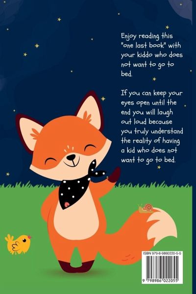 It is time for bed, but is your kiddo ready? Good Night Good Night shares the bedtime routine of a fox who does not want to go to bed, despite singing songs, taking a bath, saying their prayers, a bedtime snack, and more. Will it ever be bedtime? Enjoy reading this "one last book" with your kiddo who also does not want to go to bed. If you can keep your eyes open until the end, you will laugh out loud, because you truly understand the reality of having a kid who does not want to go to bed. Filled with 25+ sight words for early readers, this bedtime book is soon to be the "one last book" before bed. It is time for bed, are you ready? You'll be on your way...after you read this bedtime book. Unless you didn't find the chick, snail, and ladybug, then you will need to read it again... Book Details: 6" x 9" paperback created by a mom of three from real life experiences