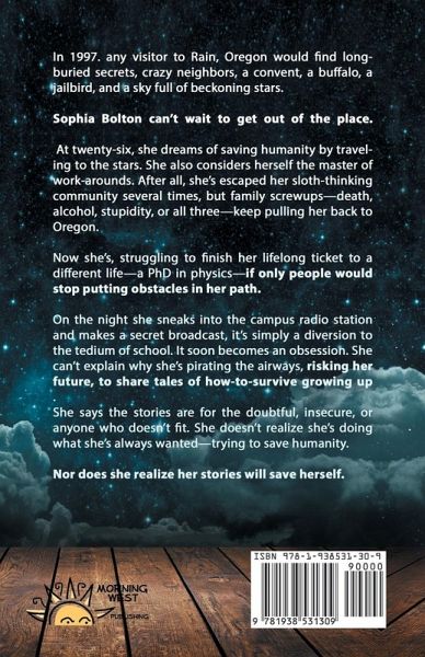 Growing-up. Moving away. Coming Back. A funny, thought-provoking, head-banging journey. In 1997. any visitor to Rain, Oregon will find long-buried secrets, crazy neighbors, a convent, a buffalo, a jailbird, and a sky full of beckoning stars. Sophia Bolton can't wait to get out of the place. At twenty-six, she dreams of saving humanity by traveling to the stars. She also considers herself the master of work-arounds. After all, she's escaped her sloth-thinking community several times, but family screwups-death, alcohol, stupidity, or all three-keep pulling her back to Oregon. Now she's, struggling to finish her lifelong ticket to a different life-a PhD in physics-if only people would stop putting obstacles in her path. On the night she sneaks into the campus radio station and makes a secret broadcast, it's simply a diversion to the tedium of school. It soon becomes an obsession. She can't explain why she's pirating the airways, risking her future, to share tales of how-to-survive growing up. She says the stories are for the doubtful, insecure, or anyone who doesn't fit. She doesn't realize she's doing what she's always wanted-trying to save humanity. Nor does she realize her stories will save herself. A memorable story tale of humor, heartbreak, and inspiration.