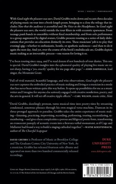 With Good night the pleasure was ours, David Grubbs melts down and recasts three decades of playing music on tour into a book-length poem, bringing to a close the trilogy that includes Now that the audience is assembled and The Voice in the Headphones. In Good night the pleasure was ours, the world outside the tour filters in with eccentric sparseness. From teenage punk bands to ensembles without fixed membership, and from solo performance to a group augmented by digital avatars, Grubbs presents touring as a series of daily dislocations that provides an education distinctly its own. These musicians' job is to play that evening's gig-whether to enthusiastic, hostile, or apathetic audiences-and then to do it again the next day. And yet, over the course of the book's multidecade arc, Grubbs depicts music making as an irreversible process-one reason for loving it so.