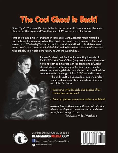 Good Night, Whatever You Are! is the first-ever in-depth look at one of the show biz icons of the 1950s and ’60s: the dean of TV horror hosts, Zacherley. First on Philadelphia TV and then in New York, John Zacherle made himself a pop culture phenomenon: When the classic Universal Horrors came to the small screen, host "Zacherley" added a touch of macabre mirth with his white makeup, undertaker’s coat, bombastic heh-heh-heh and mile-a-minute stream-of-consciousness babble. To a whole generation, he was the Cool Ghoul. Richard Scrivani met Zach while haunting the sets of Zach’s TV series Disc-O-Teen (1965-67) and over the years he went from being a Monster Kid fan to one of Zach’s closest friends. In these pages, Scrivani describes this adventure, weaving details from his own personal life into comprehensive coverage of Zach’s TV and radio career. The end result is a unique look into the professional and personal life of an extraordinary talent, John Zacherle. • Interviews with Zacherle and dozens of his friends and co-workers! • Over 150 photos, some never-before-published! Scrivani has written exactly the sort of valentine his unassuming hero deserves, and would never have found the ego to pen. – Tim Lucas, Video Watchdog