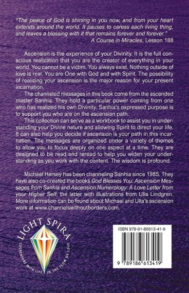Ascension is the experience of your divinity. It is the full conscious realization that you are the creator of everything in your world. You cannot be a victim. You always exist. Nothing outside of love is real. You are one with God and with Spirit. The possibility of realizing your ascension is the major reason for your present incarnation. The channeled messages in this book come from the ascended master Sanhia. They hold a particular power coming from one who has realized his own divinity. Sanhia's expressed purpose is to support you who are on the ascension path. This collection can serve as a workbook to assist you in understanding your divine nature and allowing Spirit to direct your life. It can also help you decide if ascension is your path in this incarnation. The messages are organized under a variety of themes to allow you to focus deeply on one aspect at a time. They are designed to be read and reread to help you widen your understanding as you work with the content. The wisdom is profound. Michael Hersey has been channeling Sanhia since 1985. They have also co-created the books God Blesses You: Ascension Messages from Sanhia and Ascension Numerology: A Love Letter from your Higher Self, the latter with illustrations from Ulla Lindgren. More information can be found about Michael and Ulla's ascension work at www.channelswithoutborders.com.
