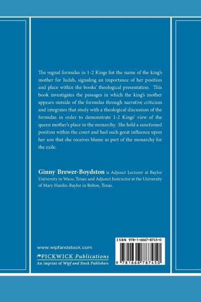 The regnal formulas in 1-2 Kings list the name of the king's mother for Judah, signaling an importance of her position and place within the books' theological presentation. This book investigates the passages in which the king's mother appears outside of the formulas through narrative criticism and integrates that study with a theological discussion of the formulas in order to demonstrate 1-2 Kings' view of the queen mother's place in the monarchy. She held a sanctioned position within the court and had such great influence upon her son that she receives blame as part of the monarchy for the exile.