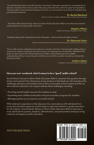 Have you ever wondered, what it means to be a "good" public school? Good Schools: Stories to Inform Public Education Reform, examines this question through stories and research from classrooms across America. In this book you will read about the challenges educators and students face in the current public school context and the creative solutions educators are using to address these challenges, including: Providing mental health resources for students in need Expanding early childhood education and post secondary programs for students Reimagining the way we measure successful schools With Anderson's experience in the classroom, his conversations with individuals from across the education spectrum, and his hope to make and maintain a quality education for all students - Good Schools: Stories to Inform Public Education Reform becomes a must-read book for parents, teachers, administrators, and policymakers looking to bring creativity and equity to public education.
