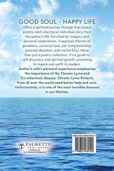Unveiling Life's Spiritual Journey Through Poems: Universe's Love, The Power of Goodness, Pets' Affection, Parents' Devotion, and Angelic Spouse's Charm. Delve into a world of spiritual enlightenment through the author's emotional journey, captured beautifully in the form of five distinct poems, each with its unique story. The book, Good Soul - Happy Life, is a compilation of heartfelt verses that delve into various aspects of life, illuminating the path of spirituality and positivity. The book starts with 'Our Universe Love', a poem that explores the boundless affection and guidance we receive from the cosmos. It is followed by 'Being A Good Person', a profound poem that emphasizes the essence of goodness and its impact on our lives. The next poem, 'Our Pets' Love', is a tribute to our furry friends, celebrating their unconditional love and companionship, a testament to the author's life experiences with pets. We then move on to 'My Parents' Love', a touching ode to the author's parents' unwavering devotion and the lessons they imparted. The book concludes with 'My Beautiful Angel Wife', a charming tribute to the author's spouse, encapsulating the angelic charm and love that she brings to his life. Each poem is accompanied by a 'Story Behind the Poem' section, providing readers with a deeper understanding of the author's spiritual experiences that inspired the verses. The book is adorned with images and pictures, further enhancing the reading experience by providing a visual representation of the author's journey. Good Soul - Happy Life is more than a book of poems; it's a spiritual guide that inspires readers to embark on their journey towards self-discovery and spiritual growth. It is a testament to the power of love, the strength of goodness, and the value of life's simple pleasures. This book is a must-read for anyone seeking inspiration and a fresh perspective on life. Get ready to embark on a spiritual journey like no other, as you unravel the intricacies of life through the insightful verses of Good Soul - Happy Life. This book promises to touch your heart, uplift your spirit, and inspire you to appreciate life's beautiful journey. Author's wife's personal experience emphasizes the importance of the Chronic Lyme and Co-Infections disease. Chronic Lyme Patients from all over the world need better help and care.