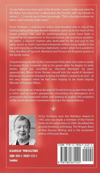 The novel Good Stalin is inspired by Erofeev's experience growing up amidst the Soviet political hierarchy. His father, a staunch Stalinist who has dedicated his life and soul to the party, begins as Stalin's personal interpreter, and rises rapidly to the top of the political ladder and into the leader's inner circle. The book reflects the family's prestigious - and yet precarious - position as members of the nomenklatura. In one memorable scene, the main character Victor recalls how he would walk past the Kremlin as a child and comment to friends, "that's where my father works - he and Comrade Stalin". However, unquestioning devotion to the Communist Party does not come to young Viktor so easily as it had for his father: growing up, he begins to write stories classified as "obscene literature" by the party. Like Erofeev himself, Victor gets involved in the world of dissident literature, violating Soviet censorship laws and being expelled from the Writers' Union. His actions result in the end of his father's career, just at the point when he hoped to be appointed Deputy Minister of Foreign Affairs. Erofeev's autobiographical novel provides both a child's and an adult's perspective on several decades of Soviet history. The book documents not only the emergence of a prominent writer, but also looks at the evolution of the Soviet dissident movement amongst the nomenklatura.