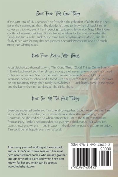 Set in the high-stakes world of horse racing, the Good Things Come series mixes together hope, heartbreak and romance, a dash of rivalry, and a great deal of excitement.Travel from Canada's foremost track, Woodbine, to the world's top racing venues, including Gulfstream and Meydan, Dubai. Tackling the sport of kings from the other side - the people who give their hearts and souls to the horses - it follows the loves and lives of a group of friends trying to find balance amid the highs and lows of their demanding careers. If you love accurate, well-written horse racing fiction, with equine and human characters you'll come to think of as friends and family, you've found your next favorite series! Book 4: This Good Thing If the sum total of Liv Lachance's self-worth is the collection of all the things she's done, she's coming up short. She decides it's time to throw herself back into her career as a jockey, even if her impending marriage to fellow rider Nate Miller incites conflict of interest rumblings. But life has other ideas for Liv when a death in the family and illness in the Triple Stripe ranks turn everything upside-down, and she's finally faced with learning that her greatest accomplishments are about so much more than winning races. Book 5: Merry Little Things A parallel, holiday-themed story to This Good Thing, (Good Things Come Book 4). If Emilie Lachance keeps herself busy enough, she'll never have to admit she's afraid of her own company. She has the family farm to oversee, hours to fulfil for an internship, horses to school and a friend with a busy café to help. But when she takes on one too many things she's totally overwhelmed - until friends come to the rescue, and she learns she's not as alone as she thinks she is. Book 6: All The Best Things Everyone expected Emilie and Tim to end up together. Except when she met Tim at Liv and Nate's wedding, he was basically rude, then after messaging her at Christmas, he ghosted her. So when Nate invites Tim to the farm to rehabilitate from an injury, Emilie's determined not to give him a third chance. But when Tim starts showing up where - and in ways - she doesn't expect, she starts to believe Tim could be her happily ever after, after all.Everyone expected Emilie and Tim to end up together. Except when she met Tim at Liv and Nate's wedding, he was basically rude, then after messaging her at Christmas, he ghosted her. So when Nate invites Tim to the farm to rehabilitate from an injury, Emilie's determined not to give him a third chance. But when Tim starts showing up where - and in ways - she doesn't expect, she starts to believe Tim could be her happily ever after, after all. Includes: This Good Thing (Good Things Come Book 4) Merry Little Things (Good Things Come Book 5) All The Best Things (Good Things Come Book 6)
