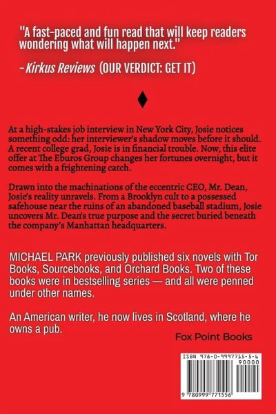 "A young woman signs her soul away to a mysterious company in Park's horrific fantasy novel ... A fast-paced and fun read that will keep readers wondering what will happen next."- Kirkus Reviews (OUR VERDICT: GET IT)*** At a high-stakes job interview in New York City, Josie notices something odd: her interviewer's shadow moves before it should. A recent college grad, Josie is in financial trouble. Now, this elite offer at The Eburos Group changes her fortunes overnight, but it comes with a frightening catch. Drawn into the machinations of the eccentric CEO, Mr. Dean, Josie's reality unravels. From a Brooklyn cult to a possessed safehouse near the ruins of an abandoned baseball stadium, Josie uncovers Mr. Dean's true purpose and the secret buried beneath the company's Manhattan headquarters. *** Interested in learning more about careers at The Eburos Group? At Eburos, we empower our clients to achieve their goals. As part of our team, you will: Serve as a medium- and long-term host for clients, including in your traditional lifespan and beyond. Partner with strategic groups to manage client needs, such as for caloric intake, karmic exchange, and appendages. Facilitate workflow among Eburos teams and third-party service providers to ensure timely deliverables. Define success criteria and core metrics, including leading indicators of bloodflow levels, soul degradation, maximal pain threshold (both physical and psychic), and real estate acquisitions.