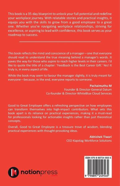 This book is a 35-day blueprint to unlock your full potential and redefine your workplace journey. With relatable stories and practical insights, it equips you with the skills to grow from a good employee to a great one. Whether you're navigating workplace relationships, striving for excellence, or aspiring to lead with confidence, this book serves as your roadmap to success.