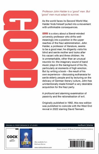 Professor John Halder is a 'good' man. But 'good' men must adapt to survive. As the world faces its Second World War, Halder finds himself pulled into a movement with unthinkable consequences. Good is a story about a liberal-minded university professor who drifts well-meaningly into a position in the upper reaches of the Nazi administration. John Halder, a professor of literature, seems to be a good man; he diligently visits his blind and senile mother and looks after his vacant wife and three children. He is unremarkable, other than an unusual neurotic tic: the imaginary sound of band music plays in the background of his life, particularly at moments of high emotion. But by writing a book - the result of his own experience - discussing euthanasia for senile elderly people and by lecturing on the delicacy of German literary culture, John has unintentionally made himself a very desirable acquisition for the Nazi party. A profound and alarming examination of passivity and the rationalisation of evil. Originally published in 1982, this new edition was published to coincide with the West End revival in 2022 starring David Tennant.