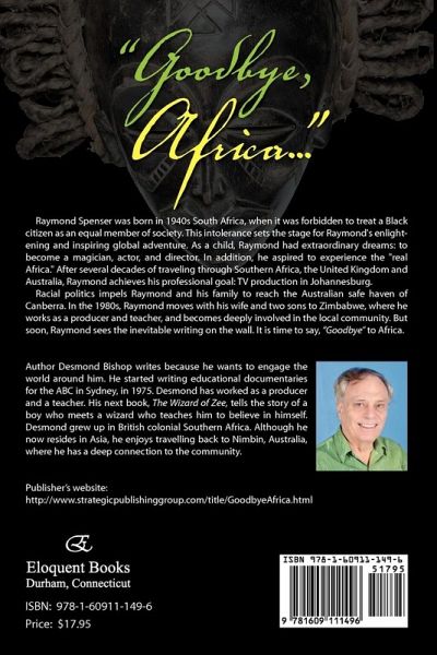Raymond Spenser was born in 1940s South Africa, when it was forbidden to treat a Black citizen as an equal member of society. This intolerance sets the stage for Raymond's enlightening and inspiring global adventure. As a child, Raymond had extraordinary dreams: to become a magician, actor, and director. In addition, he aspired to experience the "real Africa." After several decades of traveling through Southern Africa, the United Kingdom and Australia, Raymond achieves his professional goal: TV production in Johannesburg. Racial politics impels Raymond and his family to reach the Australian safe haven of Canberra. In the 1980s, Raymond moves with his wife and two sons to Zimbabwe, where he works as a producer and teacher, and becomes deeply involved in the local community. But soon, Raymond sees the inevitable writing on the wall. It is time to say, "Goodbye" to Africa. Author Desmond Bishop writes because he wants to engage the world around him. He started writing educational documentaries for the ABC in Sydney, in 1975. Desmond has worked as a producer and a teacher. His next book, The Wizard of Zee, tells the story of a boy who meets a wizard who teaches him to believe in himself. Desmond grew up in British colonial Southern Africa. Although he now resides in Asia, he enjoys travelling back to Nimbin, Australia, where he has a deep connection to the community. Publisher's website: http://www.strategicpublishinggroup.com/title/GoodbyeAfrica.html