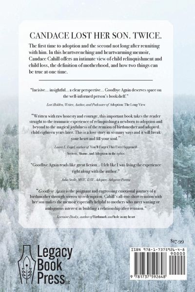 CANDACE LOST HER SON. TWICE. ¿The first time to adoption and the second not long after reuniting with him. In this heartwrenching and heartwarming memoir, Candace Cahill offers an intimate view of child relinquishment and child loss, the definition of motherhood, and how two things can be true at one time. "Incisive... insightful... a clear perspective... Goodbye Again deserves space on the well-informed person's bookshelf." Lori Holden, Writer, Author, and Podcaster of Adoption: The Long View "Written with raw honesty and courage, this important book takes the reader straight to the traumatic experience of relinquishing a newborn to adoption and beyond to the magical joyfulness of the reunion of birthmother and adopted child eighteen years later. This is a love story in so many ways and it will break your heart and fill your soul." Laura L. Engel, author of You'll Forget This Ever Happened: Secrets, Shame, and Adoption in the 1960s "Goodbye Again reads like great fiction... I felt like I was living the experience right along with the author." Julia Stolle, MSW, LSW, Adoptee, Adoptive Parent "Goodbye Again is the poignant and engrossing emotional journey of a birthmother through sorrow to redemption. Cahill's all-too-short reunion with her son makes the memoir especially helpful to mothers who meet waning or ambiguous interest in building a relationship after reunion." ~ Lorraine Dusky, author of Birthmark and hole in my heart