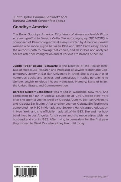 The Book Goodbye America: Fifty Years of American-Jewish Women's Immigration to Israel, a Collective Autobiography (1967-2017), is composed of 18 autobiographical essays written by American-Jewish women who made aliyah between 1967 and 2017. Each essay traces the author's path to making that choice, and describes and analyses her life after her immigration and at various crossroads of her life.