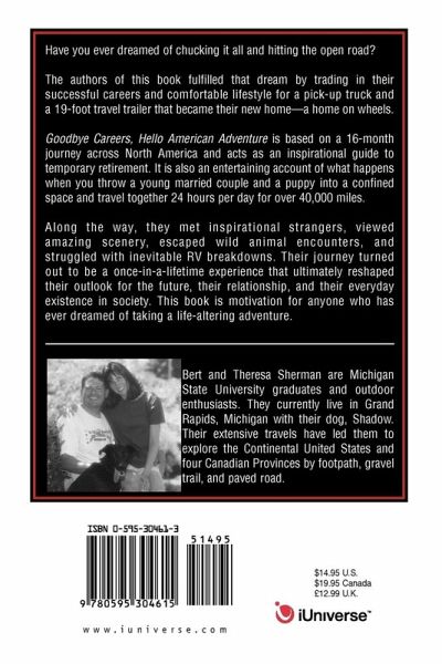 Have you ever dreamed of chucking it all and hitting the open road? The authors of this book fulfilled that dream by trading in their successful careers and comfortable lifestyle for a pick-up truck and a 19-foot travel trailer that became their new home--a home on wheels. Goodbye Careers, Hello American Adventure is based on a 16-month journey across North America and acts as an inspirational guide to temporary retirement. It is also an entertaining account of what happens when you throw a young married couple and a puppy into a confined space and travel together 24 hours per day for over 40,000 miles. Along the way, they met inspirational strangers, viewed amazing scenery, escaped wild animal encounters, and struggled with inevitable RV breakdowns. Their journey turned out to be a once-in-a-lifetime experience that ultimately reshaped their outlook for the future, their relationship, and their everyday existence in society. This book is motivation for anyone who has ever dreamed of taking a life-altering adventure.