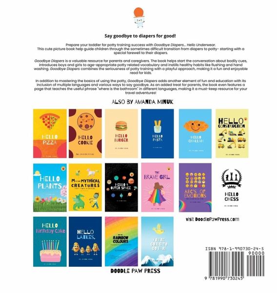Prepare your toddler for potty training success with Goodbye Diapers... Hello Underwear. This cute picture book help guide children through the sometimes difficult transition from diapers to potty- starting with a special farewell to their diapers. Goodbye Diapers is a valuable resource for parents and caregivers. The book helps start the conversation about bodily cues, introduces boys and girls to age-appropriate potty related vocabulary and instills healthy habits like flushing and hand washing. Goodbye Diapers combines the seriousness of potty training with a playful approach, making it a fun and enjoyable read for kids. In addition to mastering the basics of using the potty, Goodbye Diapers adds another element of fun and education with its inclusion of multiple languages and various ways to say goodbye. As an added treat for parents, the book even features a page that teaches the useful phrase "where is the bathroom" in different languages, making it a must-keep resource for your travel adventures!