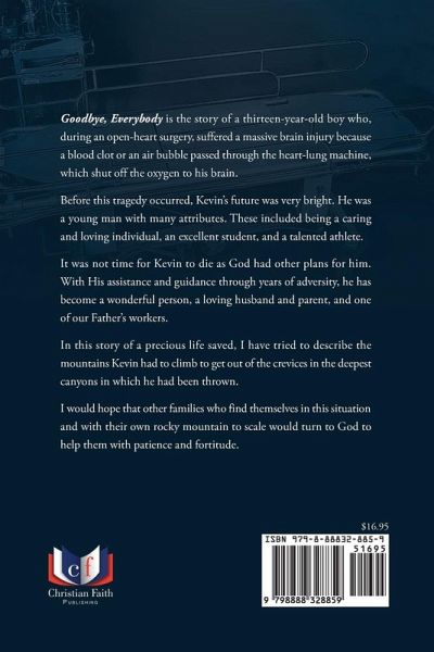 Goodbye, Everybody is the story of a thirteen-year-old boy who, during an open-heart surgery, suffered a massive brain injury because a blood clot or an air bubble passed through the heart-lung machine, which shut off the oxygen to his brain. Before this tragedy occurred, Kevin's future was very bright. He was a young man with many attributes. These included being a caring and loving individual, an excellent student, and a talented athlete. It was not time for Kevin to die as God had other plans for him. With His assistance and guidance through years of adversity, he has become a wonderful person, a loving husband and parent, and one of our Father's workers. In this story of a precious life saved, I have tried to describe the mountains Kevin had to climb to get out of the crevices in the deepest canyons in which he had been thrown. I would hope that other families who find themselves in this situation and with their own rocky mountain to scale would turn to God to help them with patience and fortitude.