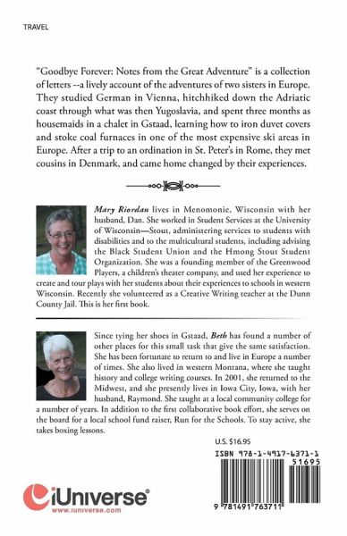 "Goodbye Forever: Notes from the Great Adventure" is a collection of letters --a lively account of the adventures of two sisters in Europe. They studied German in Vienna, hitchhiked down the Adriatic coast through what was then Yugoslavia, and spent three months as housemaids in a chalet in Gstaad, learning how to iron duvet covers and stoke coal furnaces in one of the most expensive ski areas in Europe. After a trip to an ordination in St. Peter's in Rome, they met cousins in Denmark, and came home changed by their experiences.