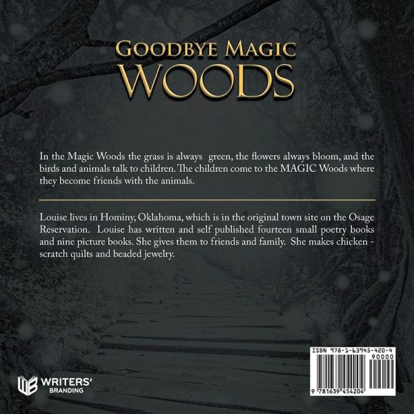Autobiography: Louise lives in Hominy, Oklahoma, which is in the original town site on the Osage Indian Reservation. Louise has written and self published fourteen small poetry books and nine picture books. She gives them to friends and family. She makes chicken-scratch quilts and beaded jewelry. Book Synopsis: In the Magic Woods the grass is always green, the flowers always bloom, and the birds and animals talk to children. The children come to the MAGIC Woods where they become friends with the animals.