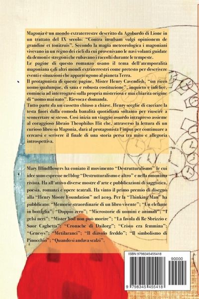 Magonia è un mondo extraterrestre descritto da Agobardo di Lione in un trattato del IX secolo: "Contra insulsam vulgi opinionem de grandine et tonitruis". Secondo la magia meteorologica i magoniani vivevano in un regno dei cieli da cui provenivano le navi volanti guidate da demoni e stregoni che rubavano i raccolti durante le tempeste. Le pagine di questo romanzo usano il tema dell'atemporalità magoniana e di altri mondi extraterrestri come pretesto per descrivere eventi e situazioni che appartengono al pianeta Terra. Il protagonista di queste pagine, Mister Henry Cavendish, "un ricco uomo qualunque, di sana e robusta costituzione", inquieto e infelice, comincia ad interrogarsi sulla propria misteriosa e mai chiarita origine di "uomo mai nato". Rievoca e domanda. >Mary Blindflowers ha coniato il movimento "Destrutturalismo" le cui idee sono espresse nel blog "Destrutturalismo e altro" e nella omonima rivista. Ha all'attivo diverse mostre d'arte e pubblicazioni di saggistica, poesia, romanzi e opere teatrali. Ha vinto il primo premio di disegno alla "Henry Moore Foundation" nel 2019. Per la "Thinking Man" ha pubblicato: "Memorie straordinarie di un libro vivente"; "Un elefante in bottiglia"; "Doppio zero"; "Microstorie di uomini e animali"; "I gelsi neri"; "Mister Yod non può morire"; "La favola di Re Sbrizzio e Suor Caghetta"; "Cronache di Dailorg"; "Cristo era femmina"; "Genesys"; "Metilaranci"; "Il diavolo freddo"; "Il simbolismo di Pinocchio"; "Quando si andava scalzi".