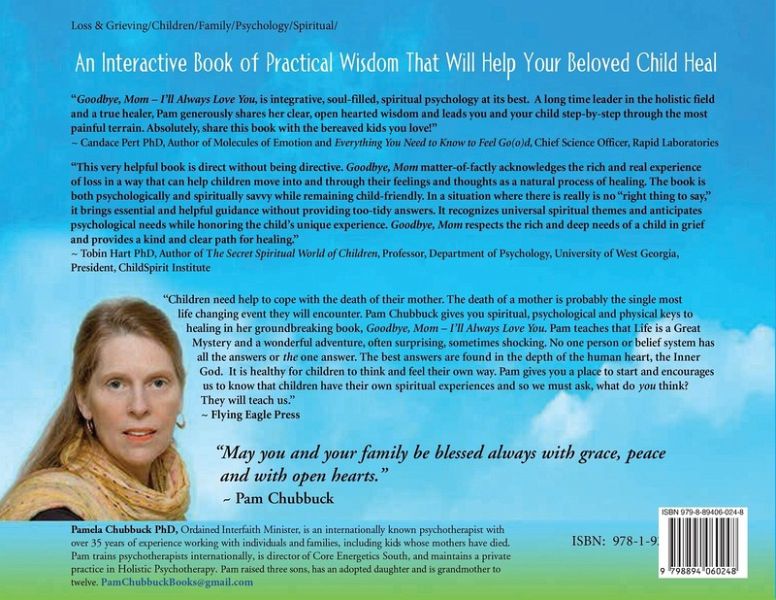 Dr. Pam Chubbuck, a world-wide respected therapist, has written the most comprehensive book to date on how to deal with the experience of losing a mother. The workbook/art therapy aspect in Goodbye, Mom. I'll Always Love You is genius! There is no better way to help youngsters through their trauma than the combined art, writing, and emotional movement processes that Dr. Chubbuck masterfully shows us. Part one is for Kids. Part two is for all caregivers: How Caregivers Can Help Children with the Great Mystery of Life and Death.
