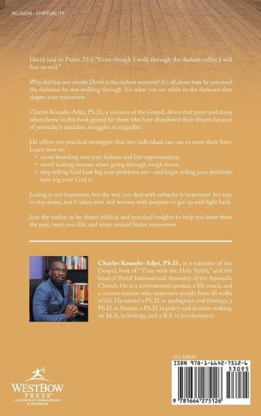 David said in Psalm 23:4, "Even though I walk through the darkest valley, I will fear no evil." Why did fear not cripple David in his darkest moment? It's all about how he perceived the darkness he was walking through. It's what you see while in the darkness that shapes your tomorrow. Charles Konadu-Adjei, Ph.D., a minister of the Gospel, drives that point and many others home in this book geared for those who have abandoned their dreams because of yesterday's mistakes, struggles or tragedies. He offers ten practical strategies that any individual can use to reset their lives. Learn how to: ¿ avoid brooding over past failures and lost opportunities; ¿ avoid making excuses when going through tough times; ¿ stop telling God how big your problems are-and begin telling your problems how big your God is. Losing is not important, but the way you deal with setbacks is important. It's easy to stay down, but it takes men and women with purpose to get up and fight back. Join the author as he shares biblical and practical insights to help you learn from the past, reset your life, and move toward better tomorrows.